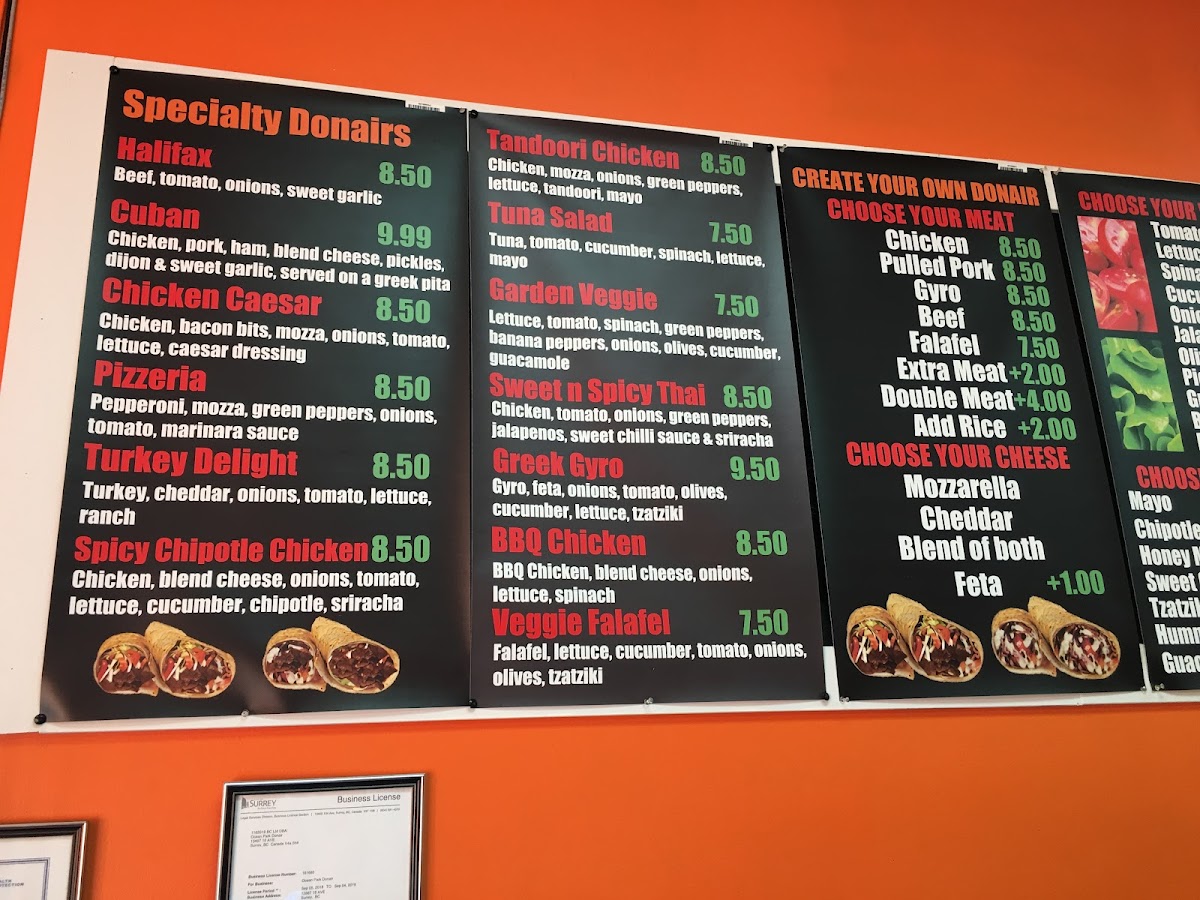 Each donair is served on soft pita bread and comes with a choice of meats and customizable toppings, making it easy to tailor your meal to your taste. Whether you're stopping by for a quick bite or gathering with friends for a satisfying meal, the experience is laid-back and inviting. The menu also includes options like the Chicken Caesar donair and the Pizzeria donair, which balance familiar comforts with a touch of creativity.